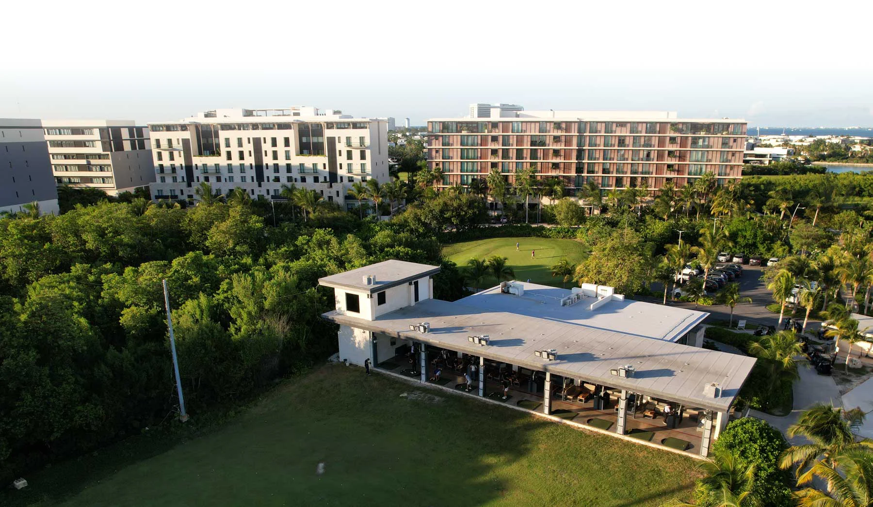 El único campo de tiro virtual en Cancún. Tecnología Toptracer rastrea cada tiro en tiempo real con datos de distancia, velocidad y trayectoria en pantalla: la misma que se usa en las transmisiones profesionales de golf.